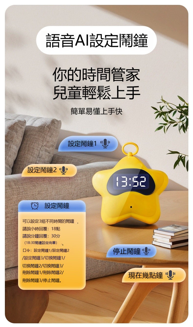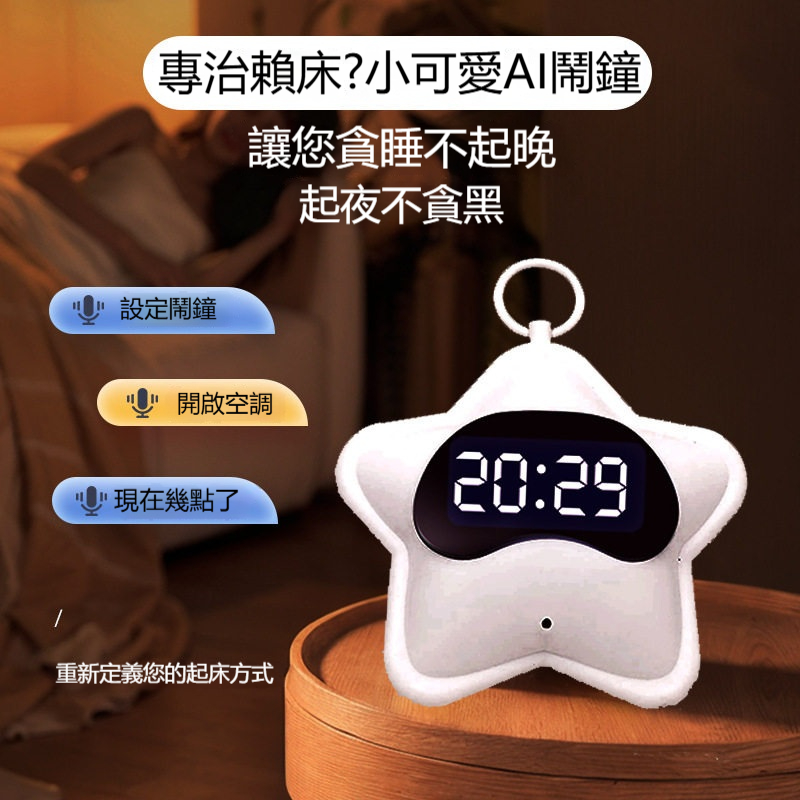 語音鬧鐘(學生專用起床叫醒神器/智能語音控制/電子時鐘/兒童鬧鈴)✅ 語音控制,用喊的就好 → 說「設定明天早上七點鬧鐘」,它就自動幫你設好 ✅ 智能語音辨識 → 中文指令聽得懂,小孩、阿公阿嬤都會用 ✅ 叫醒神器,多種鬧鈴音 → 可選傳統鈴聲、輕音樂、或錄製自己的聲音(媽媽親聲呼叫) ✅ 大數字顯示螢幕 → 時間清楚一看就知,晚上自動調節亮度不刺眼